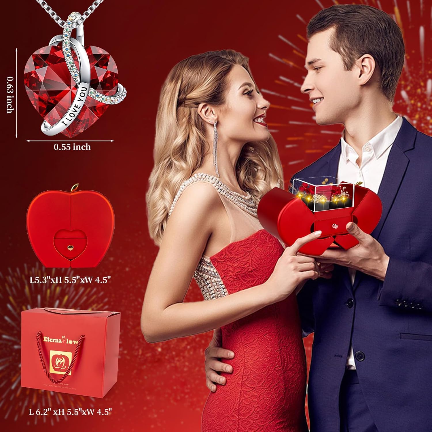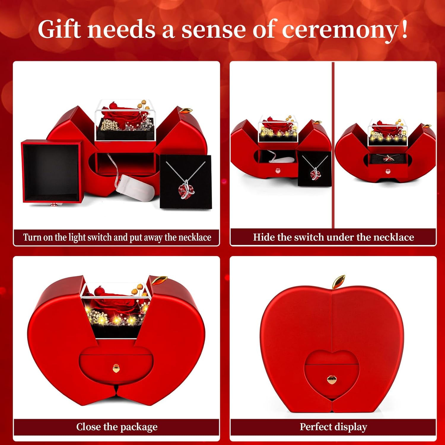 - β€οΈ[Inspired by "The Apple of My Eye"]Apple-shaped luxury box inspired by "the Apple of My Eye" , It hides a blooming eternal rose . Upgraded Built-in LED lights embedded in rose center creates breathtaking unboxing Romantic moments. Box can hold several items for long-term use with magnetic sealing, ideal for mom's vanity or bedside table. The dual storage function makes it perfect for proposal, anniversary gifts safekeeping as home decor to cherish memories daily. -+